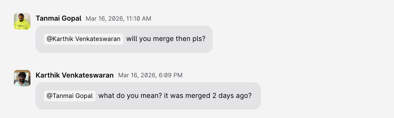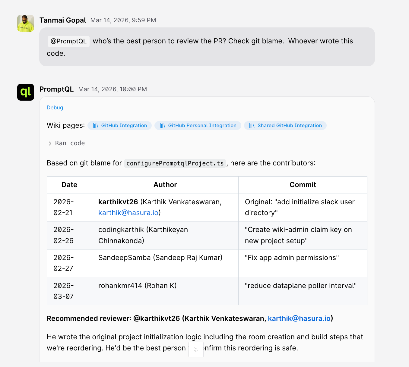 When the fix was ready, I asked who should review the PR. PromptQL ran git blame on the changed files, identified the original author, and I tagged them right from the thread. They reviewed it. We merged it.