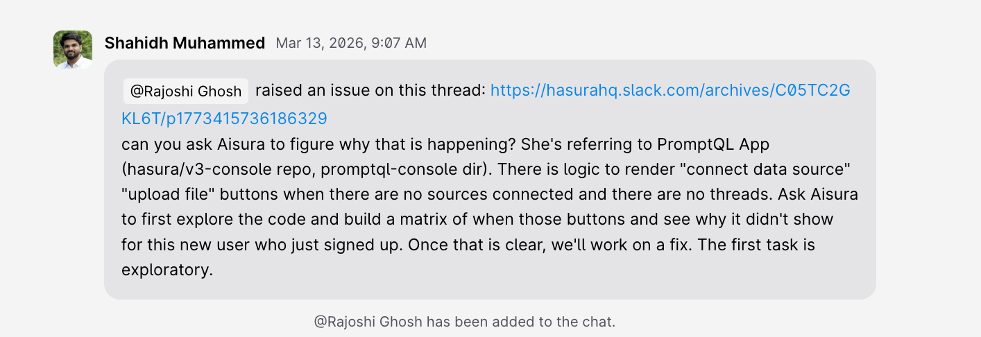I tagged Tanmai. He confirmed the hypothesis and suggested using Postgres triggers. I asked PromptQL to check the backend initialization code. More people joined—Sandeep, Rikin, Karthik—each adding context without anyone having to re-explain what we were looking at. The conversation accumulated context instead of losing it.