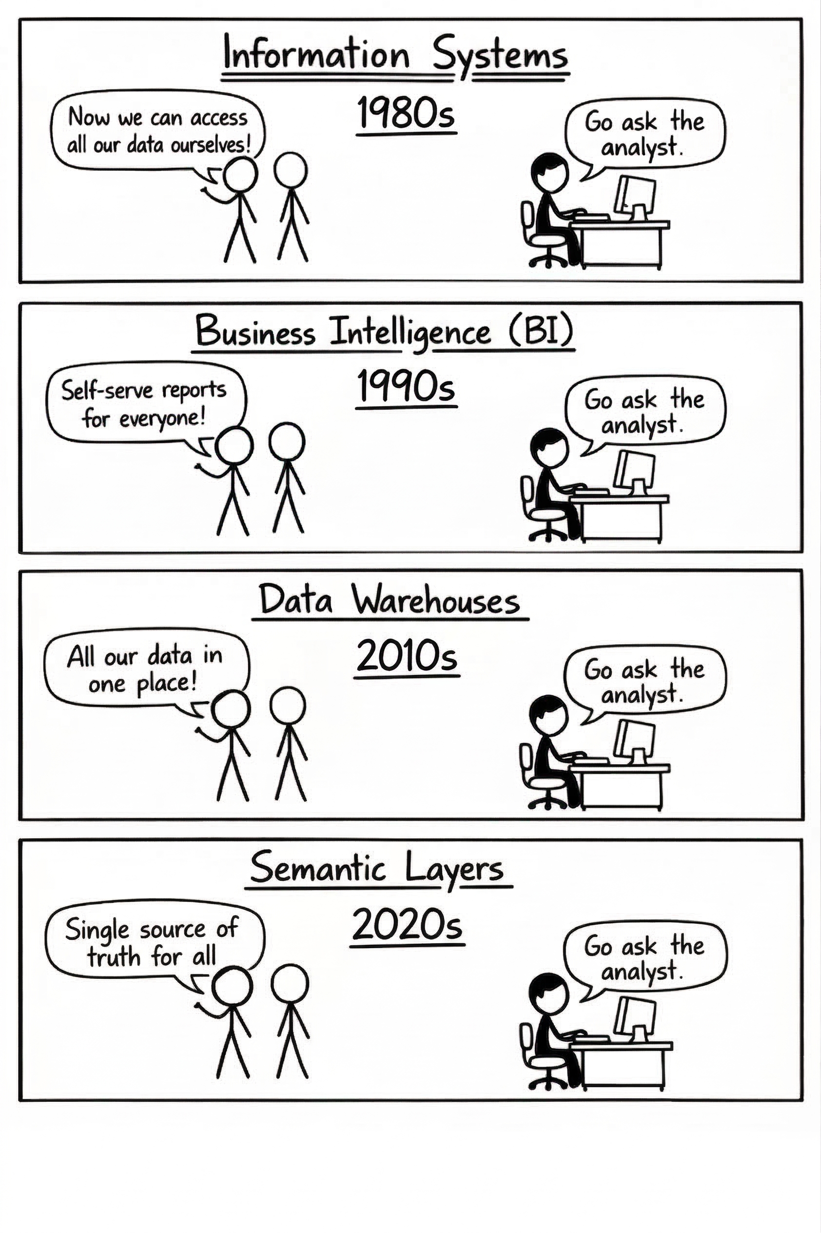 Think about the history of data in organizations. Information systems gave way to BI, which gave way to data warehouses, which gave way to semantic layers. Every generation promised the same thing: self-serve access to institutional knowledge. Every generation delivered the same outcome: go ask the analyst.