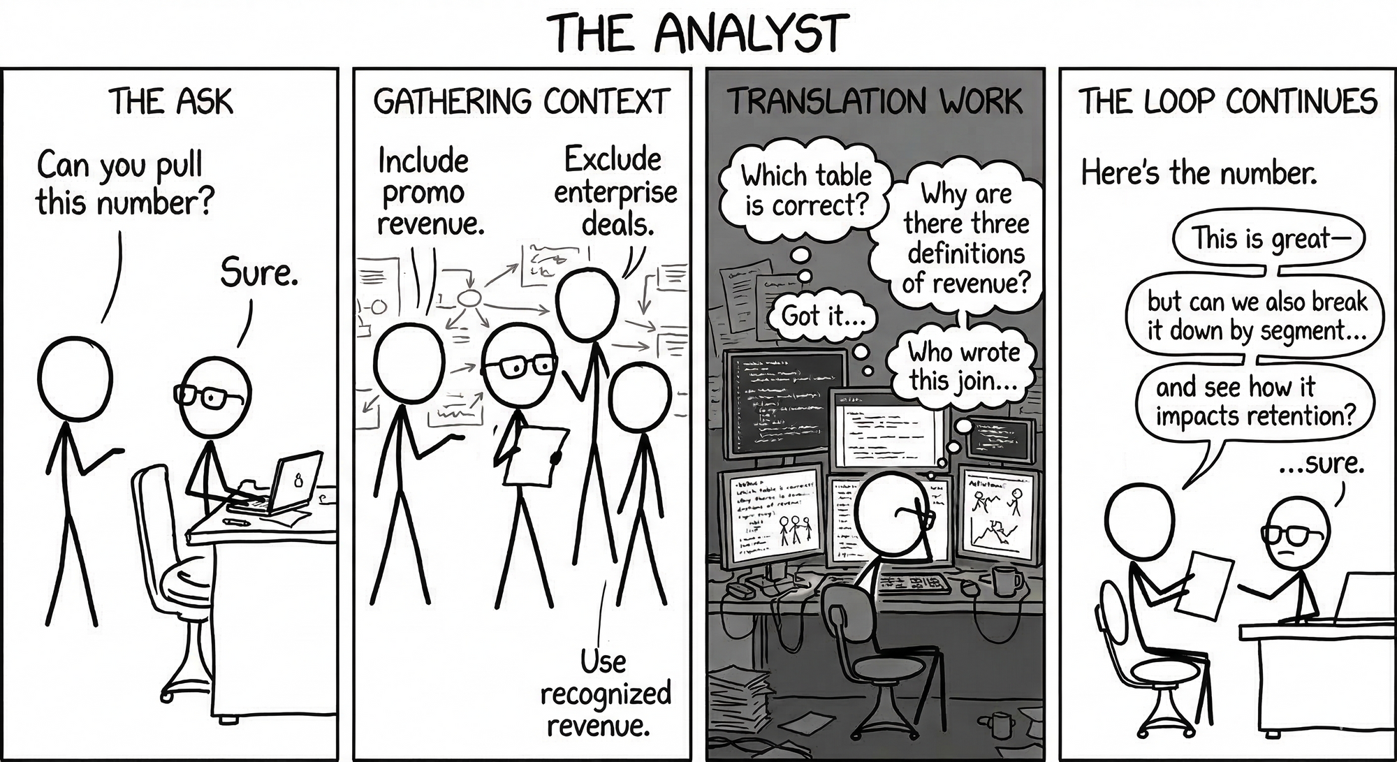 The analyst is the person who captures "context" during a meeting, maintains a piece of it in code, holds a piece of it in their head, and accepts that a piece of it is always a little lost in translation. They exist because there's a persistent skill gap between the people who have business context and the people who can encode that context into technical systems — pipelines, schemas, queries, data models.